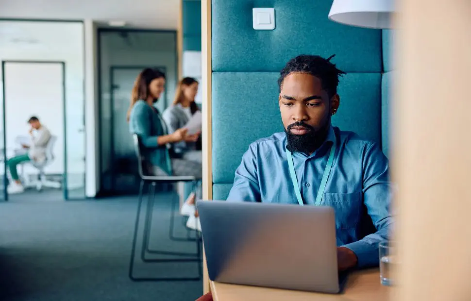 Man using desktop computer in a bright tech office.